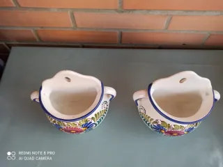Conjunto de dos jardineras de cerámica para colgar en la pared. Presentan un diseño floral pintado a mano. - Diseño con asa y orificio para colgar. - Decoración con flores y hojas en tonos vivos. - Borde superior con línea azul.