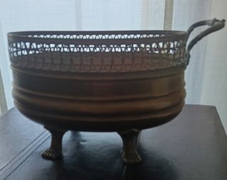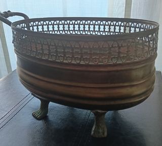 Preciosa jardinera antigua de latón con alta proporción de cobre. Tiene cuatro patas de animal de bronce y asa también en bronce. Originalmente eran dos asas pero no se nota que falta una. Tiene 16cm de altura, 18 cm de anchura y 24 cm de largura, contando el asa 28 cm. Su peso son 744 gr.