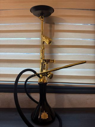 Elegante jarrón decorativo con un diseño único. - Base de metal en color negro. - Detalles en metal dorado. - Acabado brillante.
