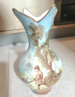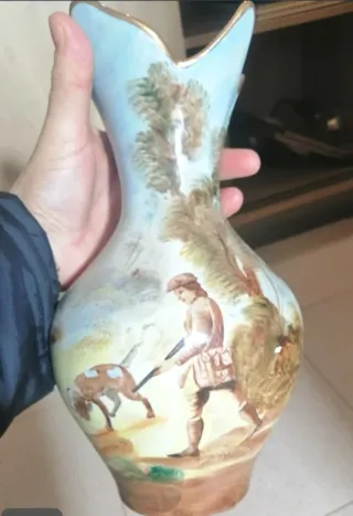 Precioso jarrón antiguo decorado con una escena de caza. - Diseño pintado a mano. - Acabado en tonos azules y marrones. - Material de cerámica. - Tamaño de unos 27 cm de alto X 16 cm de diámetro en la parte más ancha . Está en buen estado.