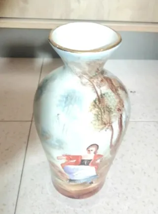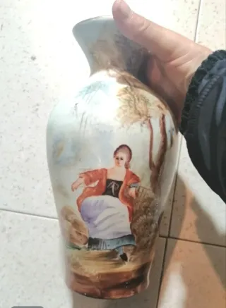 Precioso jarrón antiguo con una escena pintada a mano. - Diseño detallado con figura femenina. - Tonos multicolor y base blanca. - Medidas 26 cm de alto X 13 cm de diámetro en la parte más ancha . Está en buen estado .