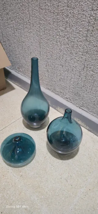Conjunto de tres jarrones decorativos de cristal. - Diseño elegante y moderno. - Tonos azules y turquesas. - Piezas únicas para tu hogar. Los tres azules son 25e los otros, diez euros, cada uno están en muy buen estado,