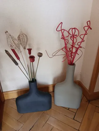 Conjunto de dos jarrones decorativos con un diseño moderno y elegante. Los 2 jarrones son 10€. - Fabricados en cerámica. - Tonos grises y negros. - Incluye elementos decorativos de mimbre.