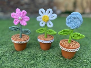 flores de ganchillo hechas a mano, cada una en su propia maceta de terracota. - Flores de ganchillo en tonos rosa, blanco con centro amarillo y azul. - Macetas de barro decoradas con encaje blanco. - Tallo y hojas de ganchillo en color verde.