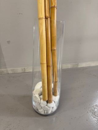 Elegante jarrón decorativo con cañas de bambú y base de piedras blancas. - Altura aproximada de la caña más alta: 2,3 metros. - Altura del jarrón: 65 cm. - Base de piedras blancas. - Jarrón de cristal transparente. Este artículo no se envía por razones de peso y fragilidad.