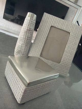 Conjunto de tres piezas decorativas en tono plateado. Incluye un marco de fotos, un jarrón y una caja. - Marco con textura cuadriculada. - Jarrón con diseño texturizado. - Caja con tapa metálica.