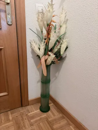 Elegante jarrón decorativo con un diseño inspirado en el bambú. - Material de vidrio y plástico. - Tonos verdes y beige.