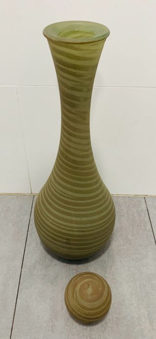 Jarrón grande . Vidrio grueso .m, por tanto es algo pesado .Tonos verdes. medidas 45 cm hasta la boca del jarrón y 53 cm hasta la bola