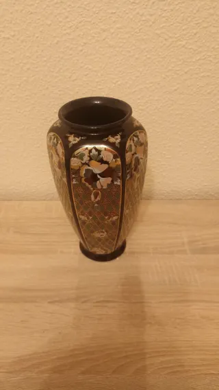 Antiguo jarrón japonés decorado al detalle de manera artesanal con la tradicional técnica closionné con motivos florales, vegetales, mariposas y otros símbolos, procedente del conocido taller Takatani Kenzaburou 高谷謙三郎 (Kioto) activo entre 1880 y 1910, con sello inciso en su base (Takatani/ 高谷), perteneciente al periodo Meiji (1868-1912). Sus dimensiones máximas son 22 cm de alto, 10 cm de diámetro máximo, 5 cm de diámetro exterior de boca, 2,8 cm de diámetro interior de boca, 4,3 cm de diámetro de base y 295 gr de peso. Se aprecian dos desperfectos del esmalte y deformación en filo de la base. Señales debidas a sus más de 100 años.