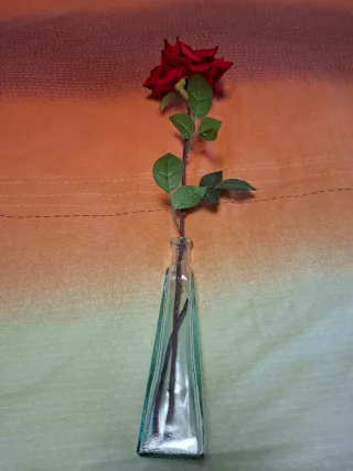 Elegante jarrón de cristal con una rosa roja artificial. - Diseño alargado y triangular. - Ideal para decorar cualquier espacio. Puedes elegir envío por Seur o por InPost