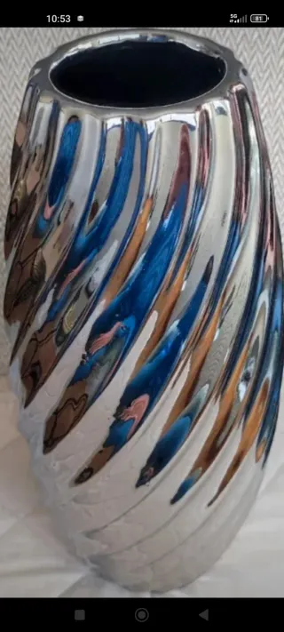 Elegante jarrón con un diseño moderno y llamativo. Su acabado brillante refleja la luz, creando un efecto visual único. - Diseño en espiral. - Tonos plateados y azules. - Material metálico.medida 30 cm