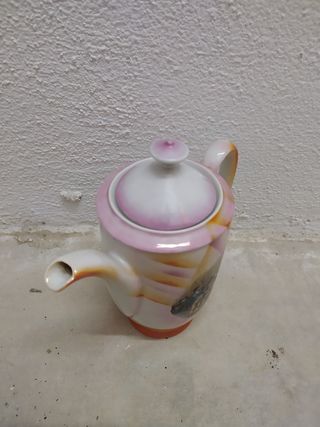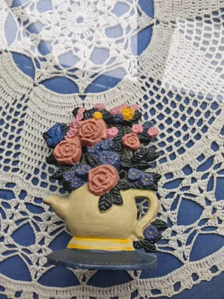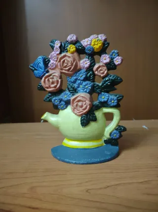 Precioso adorno de cerámica con un diseño floral y una tetera. - Detalle de mariposa. - Flores en tonos rosas, azules y amarillos. - Base decorativa.