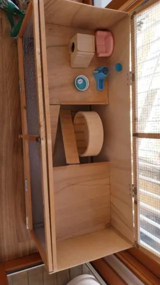 Jaula espaciosa de madera y malla metálica, ideal para hámsteres, conejos o cobayas. Cuenta con varios niveles y accesorios. - Estructura de madera. - Malla metálica para ventilación. - Accesorios incluidos: casa, bebedero y comedero. - Rueda Katlie Wonderland de Alemania de madera no hace ruido y ya costaba €70.