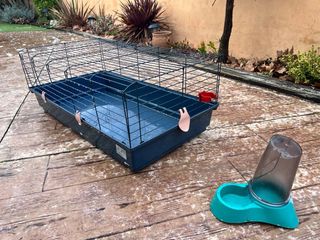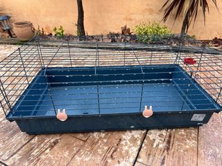 Jaula para mascotas pequeñas como cobayas o conejos. Incluye bebedero y comedero. - Bandeja de plástico. - Reja metálica. - Bebedero acoplable. - No hago envíos, posibilidad de acercar a Vigo,Nigrán, Baiona, Tomiño.