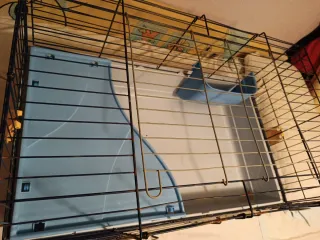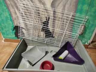 Jaula espaciosa y segura para conejos o cobayas. Cuenta con una base de plástico resistente y una estructura de alambre. - Incluye bebedero. - Bandeja de plástico azul. - Rejilla superior de alambre negro. Solo tiene 2 meses de uso, l atendemos porque ya no tenemos al conejo. Nos costó en una tienda de animales casi 90€.
