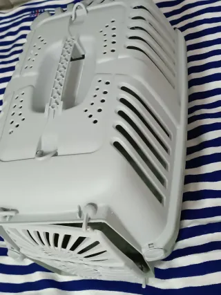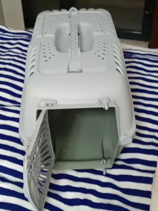 Transportín para mascotas pequeñas, ideal para gatos o conejos. Cuenta con una estructura resistente y ventilación adecuada. Usado solo 1 vez. NO HAGO ENVIOS DE ESTE PRODUCTO. - Puerta de rejilla metálica. - Asa superior para facilitar el transporte. - Incluye comedero/bebedero. - Diseño práctico y seguro.