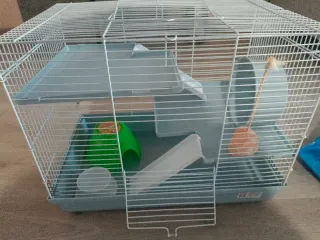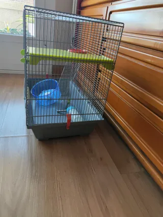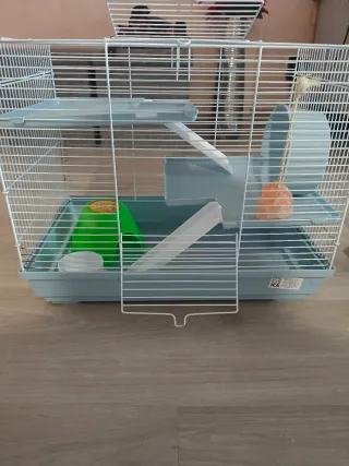 Jaula grande de 4 niveles para hámster o pequeños roedores. Mide 78cm de ancho, 45cm de fondo y 60cmnde alto. Incluimos complementos: - Rueda de ejercicios de buena calidad - Mochila para transportarlo - 2 casitas - 2 comederos - 2 bebederos - 1 puente - Arena para su baño - Varios mordedores - Algo de comida - 1 paquete de golosinas La jaula viene con dos huecos para montar un túnel. Nosotros lo quitamos porque lo ensuciaba mucho y era complicados de limpiar. Los huecos los tapabamos de forma casera. La parte de abajo (azul) es bastante alta y puede enterrarse en el papel prensado. Para limpiar simplemente cambiábamos el lecho