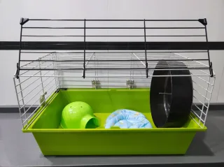 LOTE JAULA PARA PEQUEÑOS MAMÍFEROS CON COMPLEMENTOS. La jaula se puede usar para COBAYAS, CONEJOS ENANOS, ERIZOS AFRICANOS y otros pequeños mamíferos. MEDIDAS: ANCHO 58 cm FONDO 38 cm ALTO 32 cm Valor real del Lote, más de 50€ El Lote Incluye: - JAULA con base verde y estructura metálica blanca y negra. Puerta frontal grande (todo el ancho de la jaula). - RUEDA DE EJERCICIO negra a medida para la jaula (30 cm de diámetro). - Casita tipo IGLÚ de plástico verde. - Dos camas NUEVAS. Color azul. - Un paquete de PELLETS DE MADERA sustrato absorbente. 4kg aprox. Si estás interesado, vendo aparte: TRANSPORTÍN PARA PEQUEÑAS MASCOTAS.