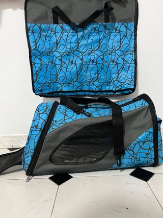 Transportin para mascotas, de buena calidad. A parte del transportin contiene en su interior una alfombra acolchada blanca, además de una bolsa en la parte trasera para guardar los papeles de su mascota, una correa grande para llevarlo colgado y tambien tiene una bolsa grande a juego con el transportin. Las dimensiones del transportin son 54cm L x 27cm An x 30cm Al.