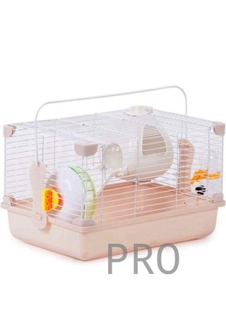 Jaula para hámster con accesorios incluidos. - Estructura de alambre plateado. - Base y accesorios de plástico rosa. - Incluye casita con rampa y 2 bebederos , rueda y uno de comida.