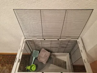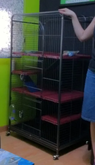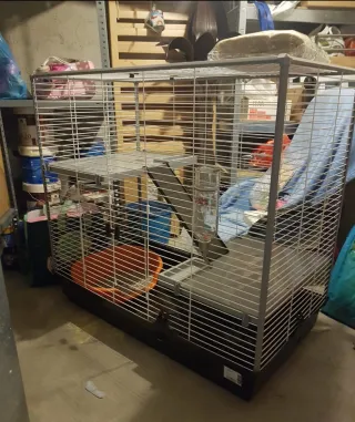 Jaula espaciosa para hurones o animales pequeños. Cuenta con varios niveles y accesorios. - La jaula tiene un roto en una esquina, pero por lo demas est genial. - viene con los 2 comederos(agya y pienso). - doy cama de invierno y otra mas para verano.