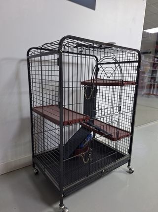 Jaula espaciosa para hurones o animales pequeños, con varios niveles y rampas. - Estructura de metal resistente. - Bandejas de plástico extraíbles para facilitar la limpieza. - Ruedas para un fácil desplazamiento.