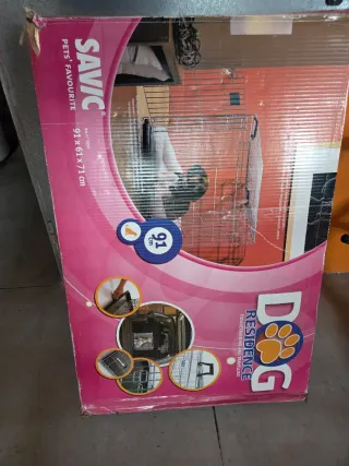 Jaula metálica para perros, fácil de plegar y transportar. - Estructura de alambre resistente. - Puerta con cierre de seguridad. La he usado durante los primeros meses que mi perro se quedaba solo en casa y rompía las cosas. Es amplia y esta en perfecto estado.