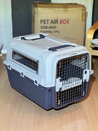 Transportin psra perros rasa grande, cumple con la normativa IATA para viajes en avion, plastico resistente, facil de armar, brinda seguridad y comodidad a la mascota.