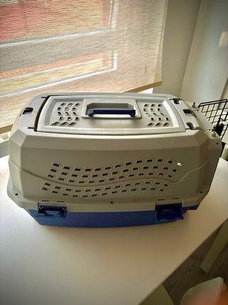 Transportín para mascotas, ideal para perros y gatos pequeños. Está en buen estado y es muy práctico para viajar con tu mascota. - Diseño ligero y fácil de transportar. - Se pliega para facilitar su almacenamiento. - Incluye una abertura superior con malla para una buena ventilación.