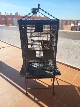 Jaula espaciosa para aves, con varios niveles y accesorios. - Bandeja extraíble para facilitar la limpieza. - Ruedas para un fácil desplazamiento. - Incluye comederos.