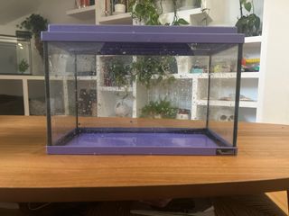 Acuario con marco morado y decoración. - Incluye filtro nuevo. - Decoración de Torre Eiffel. - Planta decorativa de colores.