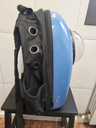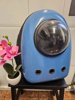 Transportín tipo cápsula para mascotas, ideal para viajes o paseos. - Diseño futurista con ventana panorámica. - Tres orificios de ventilación frontales. - Color azul brillante.