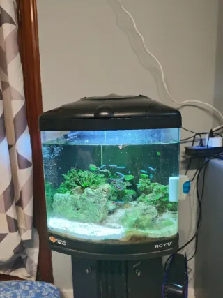 Acuario Boyu diseñado para ambientes marinos. Su diseño combina materiales negros y transparentes para una visualización clara. Mueble incluido. - Ideal para peces de agua salada. - Incluye sistema de iluminación. - Filtro integrado.