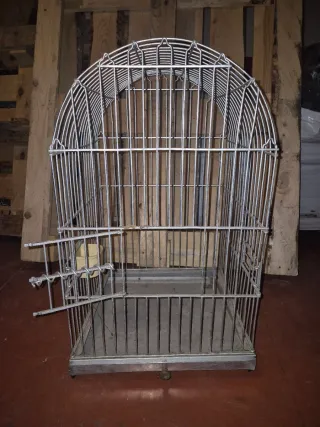 Preciosa jaula para pájaros, ideal para canarios u otras aves pequeñas. Está en buen estado y lista para un nuevo hogar. - Jaula de metal con estructura resistente. - Diseño clásico con forma redondeada en la parte superior. - Incluye una bandeja extraíble para facilitar la limpieza. - Dispone de una percha para que el pájaro se pose. 45X29X47 Tiene un poco arpado el plato de abajo pero no afecta para su uso ver última foto