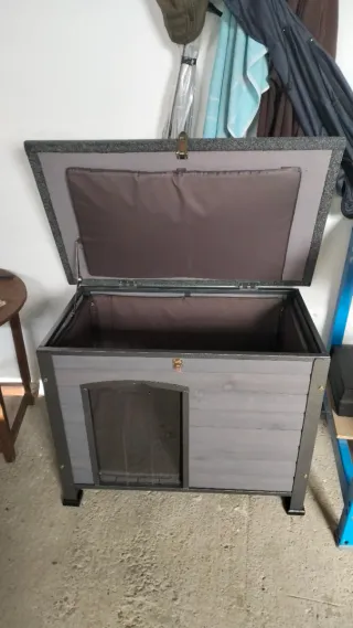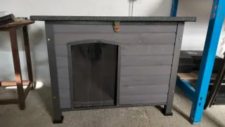 Caseta para perros, completamente nueva y ya montada. Lista para usar. Valorada en 130€ - Estructura de madera con detalles en gris oscuro. - Techo con acabado texturizado. - Puerta con forma de arco.
