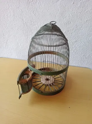 Preciosa jaula para pájaros hecha en casa. Está en buenas condiciones, aunque muestra señales de uso. Le faltan lo bebederos i el comedero k ya no los tengo - Fabricada con madera y malla metálica. - Dispone de dos compartimentos. - Incluye dos comederos.