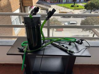 Acuario de 100 litros con su mueble a juego y varios accesorios. - Lampara led en la tapa. - Filtro acuario externo con bomba 440l/h y mangueras. - Calentador agua 100W. - Limpiafondos. - Decoraciones incluidas. - Algunos productos para cambios de agua y mantenimiento de acuario incluidos. - Paridera. NO ENVIOS
