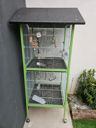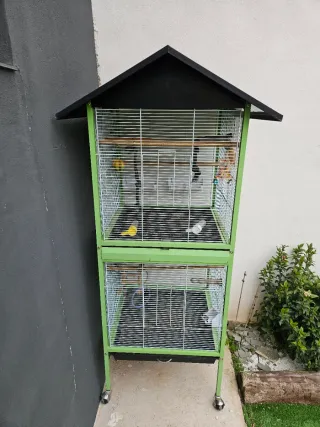 Jaula voladera de dos pisos con ruedas para facilitar su movilidad. Ideal para aves. - Estructura metálica resistente. - Techo a dos aguas. - Bandejas extraíbles para una limpieza sencilla. Se regalan comederos, bebederos, posaderas y juguetes, también nido.