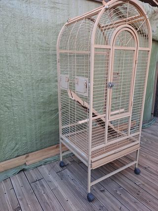 Amplia jaula para loros o aves de tamaño similar, con base y ruedas para facilitar su movilidad. - Estructura metálica resistente. - Bandeja extraíble para limpieza. - Incluye perchas de madera. - Dos comederos/bebederos metálicos.
