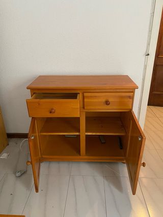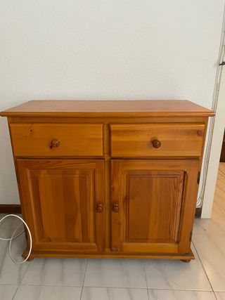 SE ENCUENTRA EN ALICANTE Mueble de madera con dos cajones y dos puertas. - Acabado en tono marrón. - Tiradores redondos.