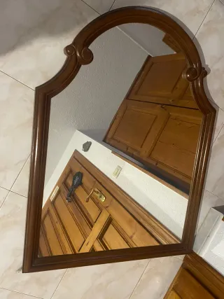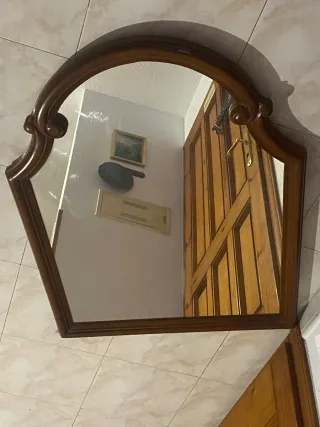 Elegante espejo con un diseño único y un marco de madera que aporta calidez. - Marco con detalles ornamentales. - Forma curva superior.