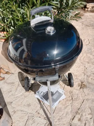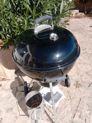Barbacoa de carbón Weber en color negro, con detalles plateados y asas de plástico. - Asa principal en la tapa. - Termómetro integrado en la tapa. - Ruedas para facilitar el transporte. - Patas de soporte.