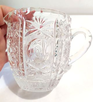 Jarra de cristal de plomo tallado con decoración en relieve, tiene más de 50 años. Medida aprox: 10 cm de alto x 8 cm de ancho. Es un cristal grueso, con cuerpo y pesado