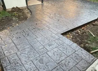 Pavimento de hormigón impreso con acabado que imita la piedra natural. - Diseño de losas rectangulares y cuadradas. - Textura detallada que simula la veta de la piedra. - Ideal para exteriores como patios, terrazas o caminos.