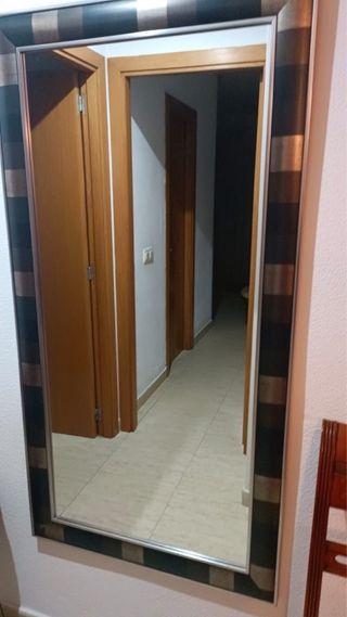 Elegante espejo de pared con un marco decorativo que añade un toque de estilo a cualquier habitación. Sus dimensiones lo hacen ideal para salones, recibidores o dormitorios. - Medidas: 150 cm de alto x 73 cm de ancho. - Marco con diseño a rayas en negro y dorado.