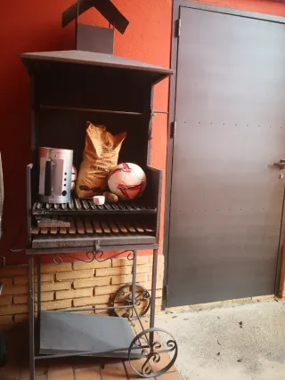 Barbacoa de exterior con un diseño robusto y funcional. Ideal para disfrutar de parrilladas al aire libre. NO EVIOS. Recogida en Sanlúcar la Mayor. - Estructura principal de metal. - Detalles en acabado plateado. - Bandeja inferior para cenizas.