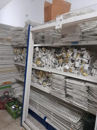 Conjunto de estanterías metálicas y diversos accesorios para su montaje. - Estructura principal de las estanterías. - Variedad de soportes y ganchos. -Separadores metálicos y cristal