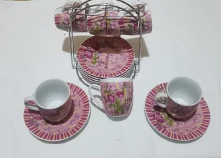 Elegante set de seis tazas y platos, con un diseño floral estilo "Shabby Chic". - Tazas con asa y sus correspondientes platos. - Incluye soporte metálico para almacenarlas. - Diseño floral en tonos rosas,verdes y blancos. - NUEVO,sin uso alguno. - #todoshabbychic 🌸 [ 👀 + 👉 Sigue Perfil ]