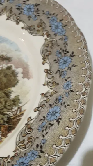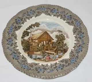 Plato de la Colección "Viejo Molino". -Pieza artesanal de loza fina,conocida por su original decoración,que incluye una greca de vegetación en tonos tierra,con motivos florales y ornamentales,destacando el viejo molino de agua integrado en un paisaje bucólico que transporta a tiempos donde lo artesanal formaba parte de la vida cotidiana. - Marca histórica en el reverso. [ 👀 + 👉 Sigue Perfil ]