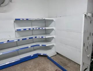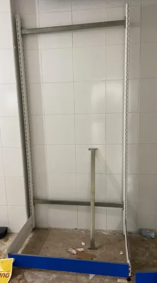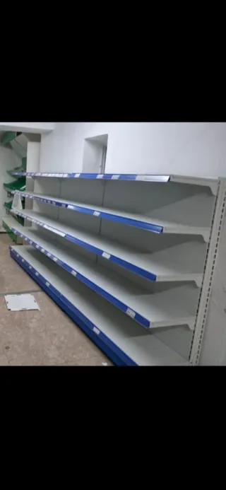Estantería metálica de diseño modular, perfecta para organizar espacios. - Estructura robusta. - Acabado en blanco y azul. -cuenta con dos esquineras para aprovechar más los espacios es marca española son muy fuerte -mosteador completo para llegar y montar en tienda cajero ordenador actualización del programa fotocopiadora preguntend en muy buen estado